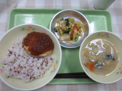 今日の献立は「古代米ごはん」「たけのこハンバーグ」「新玉ねぎのみそ汁」「ごま和え」「牛乳」です。