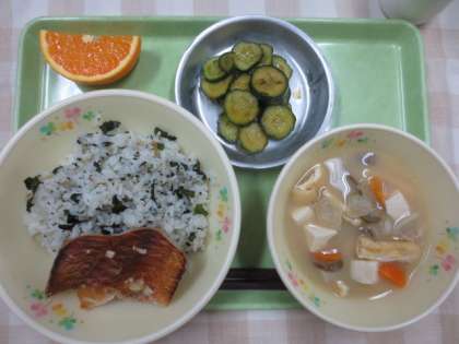 今日の献立は「わかちりごはん」「赤魚の香味焼き」「みそけんちん汁」「ぴりからきゅうり」「清見オレンジ」「牛乳」です。