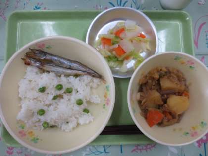 今日の献立は「グリンピースごはん」「焼きししゃも」「肉じゃが」「浅漬け」「牛乳」です。