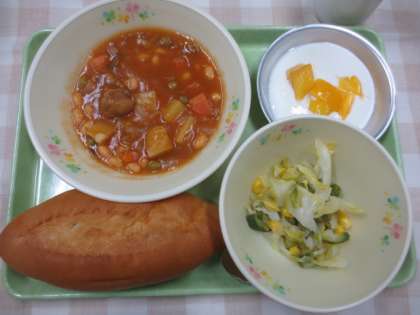 今日の献立は「ソフトフランスパン」「チキンビーンズシチュー」「フレンチサラダ」「ピーチヨーグルト」「牛乳」です。