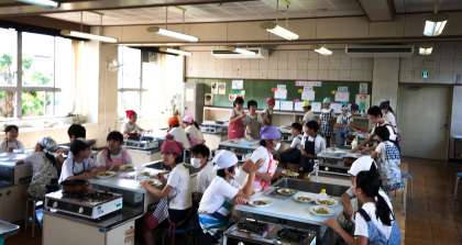 家庭科室を覗くと楽しそうに調理する6年生と、それを笑顔で見つめる先生の姿がありました。