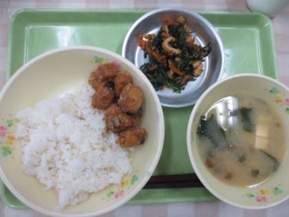 今日の献立は「麦ごはん」「かつおの竜田揚げ」「なめこのみそ汁」「ごま和え」「牛乳」です。