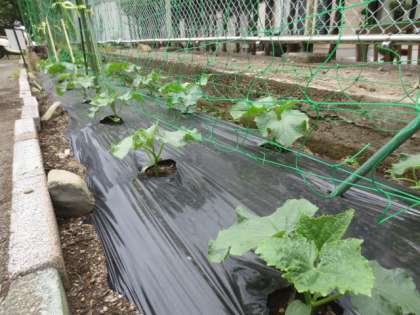 2週間前、五小のミニ給食農園に植えたきゅうりが、すくすくと成長しています!