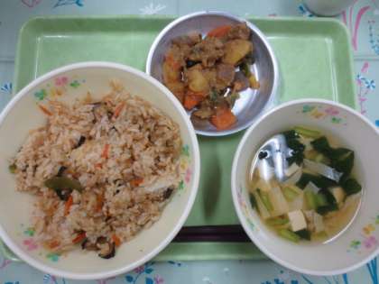 今日から6月の給食がスタートしました。献立は「ツナそぼろごはん」「ゆばのすまし汁」「新じゃがと鶏の南蛮煮」「牛乳」です。