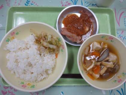 今日の献立は「ごはん」「鶏肉のみそソース」「梅おかかキャベツ」「けんちん汁」「牛乳」です。