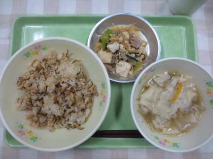 今日の献立は「ししじゅうし」「ワンタンスープ」「豆腐ちゃんぷるー」「牛乳」です。