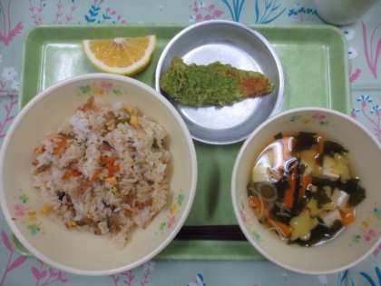 今日の献立は「とりそぼろ寿司」「笹の葉揚げ」「七夕汁」「小夏」「牛乳」です。