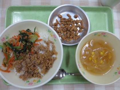 今日の献立は「切干ビビンバ」「冬瓜スープ」「豆ナッツ黒糖」「牛乳」です。