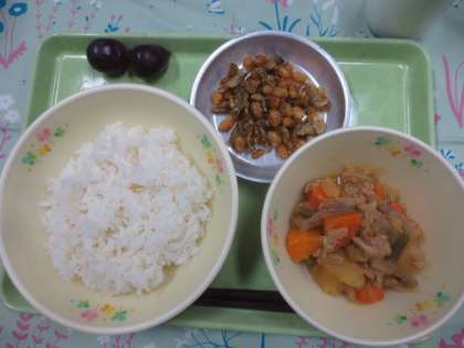 今日の献立は「ごはん」「みそ肉じゃが」「大豆とごぼうのかりんと揚げ」「巨峰」「牛乳」です。