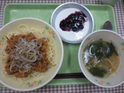 今日の献立は「ジャージャー麺」「チンゲン菜のスープ」「ヨーグルト恩方ブルーベリーソース」「牛乳」です。