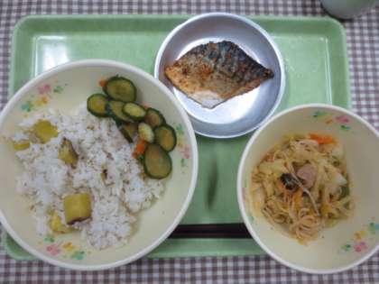 今日の献立は「さつまいもごはん」「さばのごま風味焼き」「野菜のみそ炒め」「八王子しょうがの香りきゅうり」「牛乳」です。