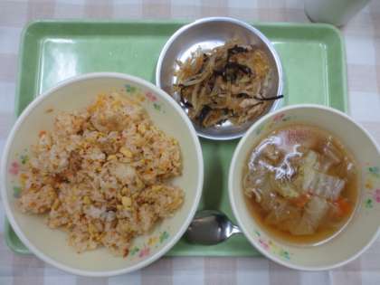 今日の献立は「キムチチャーハン」「春雨サラダ」「白菜スープ」「牛乳」です。