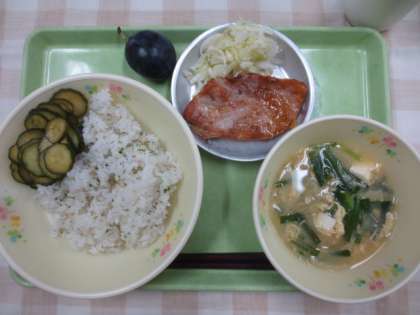 今日の献立は「磯ごはん」「豚肉のしょうが焼き」「にらたまみそ汁」「ピリカラきゅうり」「プルーン」「牛乳」です。