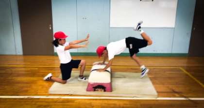 仲間と教えあいながら側方倒立回転の技のポイントを押さえていっています。 情報部 香川雄亮