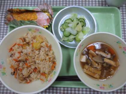 今日の鮭には、夕焼けをイメージしたマヨネーズとおろしニンジンを混ぜたソースをのせて、オーブンで焼きました。また、里山ごはんには今が旬の栗が入って、秋らしい献立となりました。