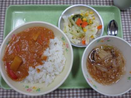 サモアは東京都の約1.3倍の国で、タロイモや青くて甘くないバナナなどを主食としているそうです。今回提供した「カレモア」はカレー味の鶏肉料理で、トマトや豆乳が入っているため、いつも給食で提供しているカレーよりも赤みがありました。