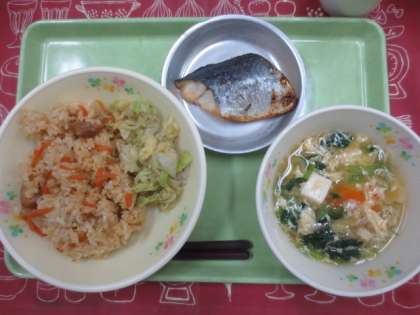 今日の献立は「人参ごはん」「さわらのみそ焼き」「かきたま汁」「香りキャベツ」「牛乳」です。