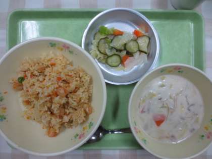 今日の献立は「エビピラフ」「きのこのクリームスープ煮」「フレンチサラダ」「牛乳」です。