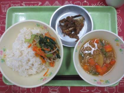 今日の献立は「麦ごはん」「さんまのごぼう煮」「韓国風肉じゃが」「三色ナムル」「牛乳」です。