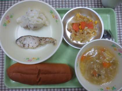 今日の献立は「ベーコンポテトサンド」「魚のハーブ焼き」「ボイル野菜のドレッシング」「ABCカレースープ」「牛乳」です。