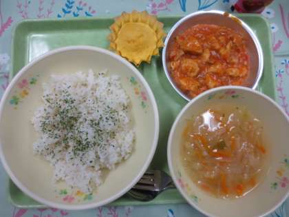 今日の献立は「ガーリックライス」「パプリカチキン」「ジュリエンヌスープ」「かぼちゃのケーキ」「ジョア」です。