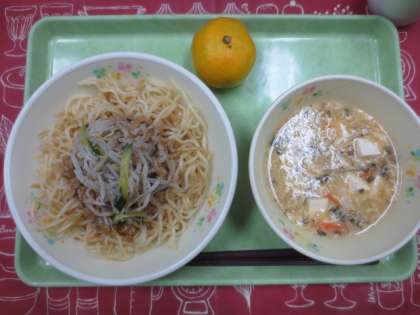 今日は、1年後に東京で開催されるオリンピック・パラリンピックの応援メニュー「せかい友だちプロジェクト献立」を提供しました。2008年にオリンピックが開催された中国の料理で、内容は「炸醤麺(ジャージャー麺)」「酸辣湯(サンラータン)」「みかん」「牛乳」です。