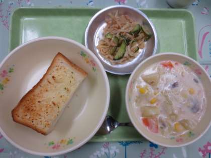 今日の献立は「ガーリックトースト」「クリームシチュー」「大根ごまサラダ」「牛乳」です。