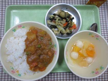 今日の献立は「チキンカレー」「わかめサラダ」「フルーツ白玉」「オレンジジュース」です。