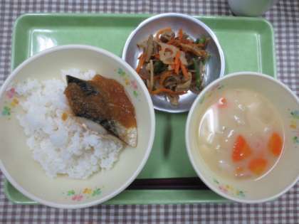 今日の献立は「ごはん」「さばのおろしソース」「呉汁」「五目きんぴら」「牛乳」です。