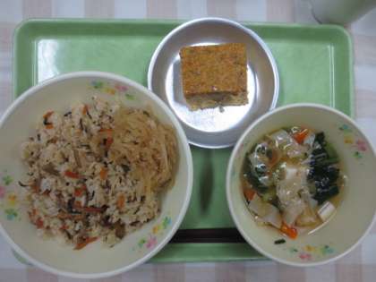 今日は、だしで味わう和食の日献立を提供しました。内容は「かやくごはん」「厚焼玉子」「ごまだいこん」「ゆばのすまし汁」「牛乳」です。
