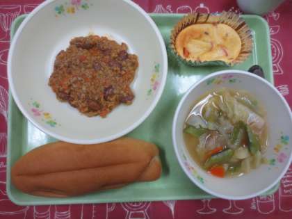 今日の献立は「チリビーンズサンド」「野菜のスープ煮」「ヨーグルトポムポム」「牛乳」です。