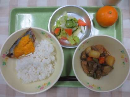 今日の献立は「ごはん」「あじのもみじ焼き」「いりどり」「柚香漬け」「みかん」「牛乳」です。