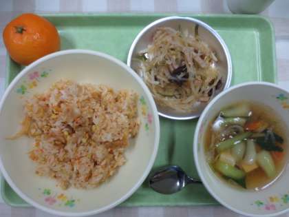 今日の献立は「キムチチャーハン」「春雨サラダ」「チンゲン菜と豆腐のスープ」「みかん」「牛乳」です。今日から12月の給食が始まり、2学期の給食も残り17回となりました。12月は、オリンピックの応援献立である「世界ともだちプロジェクト献立」のロシア料理や、9月に南大沢駅前で行われた「子ども屋台選手権」でグランプリを受賞したメニュー、冬至献立、2学期最後の給食としてクリスマス献立を提供する予定です。