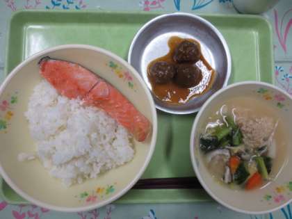 今日の献立は「ごはん」「鮭の塩焼き」「八王子産しょうがの鶏団子汁」「こんにゃくのみそ田楽」「牛乳」です。