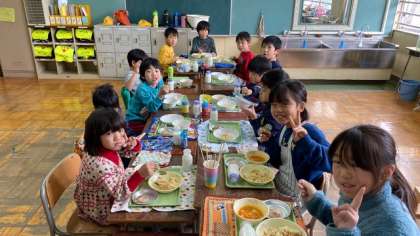 みどり学級1年生の教室に、通常の学級の1年生と4年生が来て給食交流。2つの学年が入り混じって行うのは初めてです。