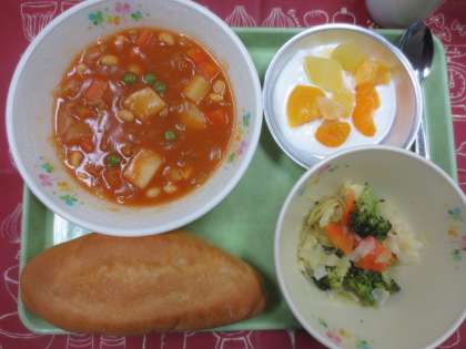 今日の献立は「チキンビーンズ」「フレンチサラダ」「フルーツヨーグルト」「牛乳」です。