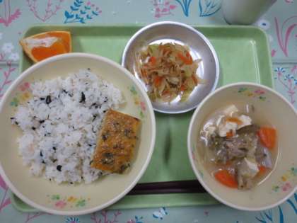 今日の献立は「わかめごはん」「厚焼玉子」「みそけんちん汁」「野菜のおかか和え」「はれひめ」「牛乳」です。