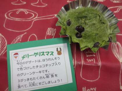 セレクトドリンクは、4種類の飲み物から事前に好きなものを選んでもらいましたが、一番人気はコーヒー牛乳でした!また、今日のデザートは、粉砕したほうれん草を混ぜて、クリスマスカラーの緑に色付けしたミニケーキを提供しました。