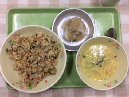 今日の献立は「チャーハン」「中華風コーンスープ」「海鮮シューマイ」「牛乳」です。