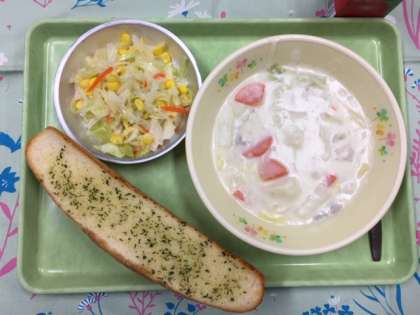 今日の献立は「ガーリックフランス」「白菜のクリームシチュー」「コールスロー」「りんごジュース」です。