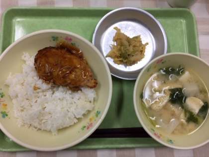 今日の献立は「ごはん」「豆腐のハンバーグえのきソース」「かぶのみそ汁」「ぴりから白菜」「牛乳」です。
