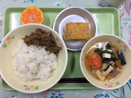 今日の献立は「麦ごはん」「厚焼玉子」「豚汁」「花ごぼう」「ぽんかん」「牛乳」です。