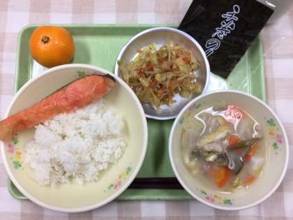 今日の献立は「セルフおにぎり」「鮭の塩焼き」「根菜汁」「野菜のおかか和え」「みかん」「牛乳」です。