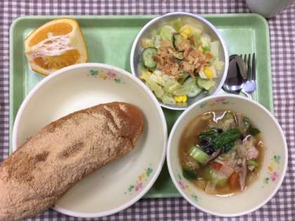 今日の献立は「きなこ揚げパン」「肉だんごスープ」「ナッツサラダ」「いよかん」「牛乳」です。