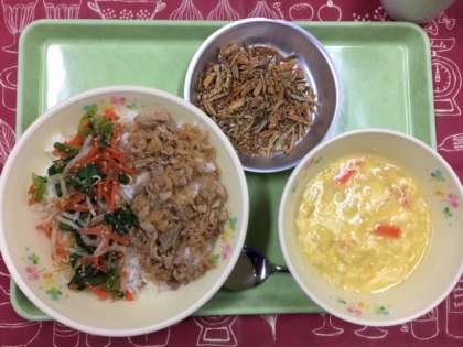今日の献立は「切干ビビンバ」「中華風玉子とコーンのスープ」「手作りさかなナッツ」「牛乳」です。
