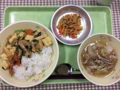 今日の献立は「ごはん」「豆腐のカレー煮」「春雨スープ」「ツナ入りにんじんシリシリ」「牛乳」です。