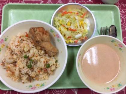 今日の献立は「ジャンバラヤ」「フライドチキン」「コールスロー」「クリーミートマトスープ」「牛乳」です。今回は、東京オリンピック・パラリンピックの応援献立である「せかいともだちプロジェクト献立」より、1996年にオリンピックが開催された「アメリカ」の料理を提供しました。