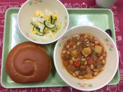 今日の献立は「ミルクパン」「ポークビーンズ」「冬キャベツと大根サラダ」「牛乳」です。ポークビーンズは、アメリカ料理の中でも家庭的なイメージのある料理です。豚肉と大豆がたくさん入っているので、たんぱく質もしっかりとれます。アメリカでは大豆ではなく、白いんげん豆を使うことが多いそうです。