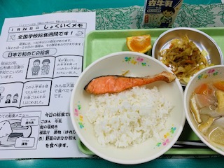 ごはん、鮭の塩焼き、根菜汁、野菜のおかか和え、果物はれひめ、牛乳です。