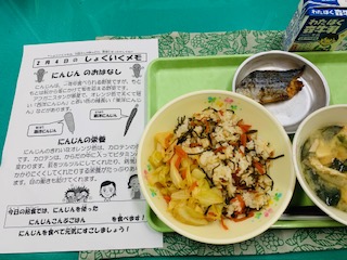 2月4日木曜日 公開日 2021/02/04 更新日 2021/02/04 給食の献立 きょうのこんだて にんじん昆布ご飯、さわらの照り焼き、ピリ辛キャベツ、ほうれん草と豆腐の味噌汁、牛乳です。 今が旬のにんじんを使い昆布とちりめんじゃこと共にしょうゆ、酒で煮込みご飯に混ぜました。鮮やかなにんじんで食が進みます。 iPhoneから送信 いいね(0)